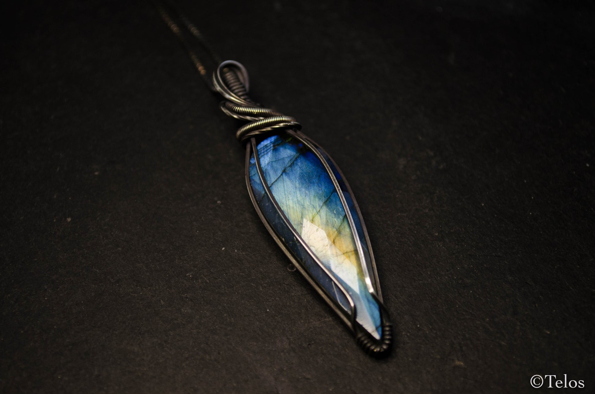 Beautiful handmade blue labradorite pendant wire wrapped on Sterling silver.